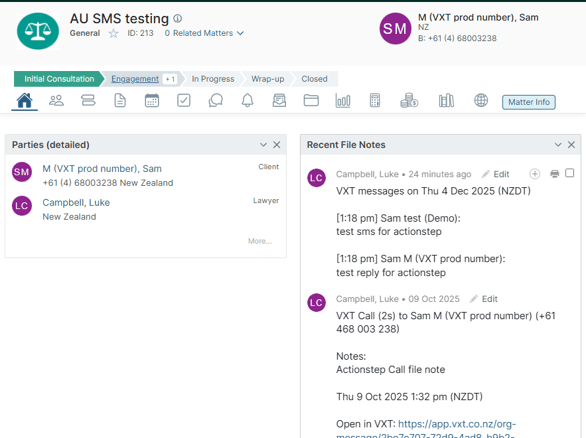 This article explains how the Actionstep integration works in VXT, including how to connect and disconnect it, as well as where notes, calls, and SMS messages are saved.
