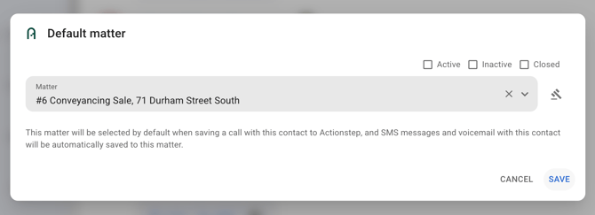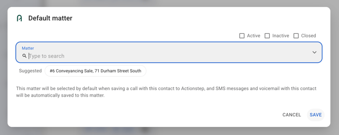 When you save a call to a matter in VXT, that matter becomes the default matter for the contact. After a matter is associated with a contact, text messages sent or received are automatically saved to the matter, and when you finish a call with the contact their default matter is automatically selected.