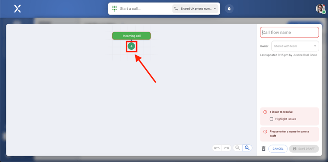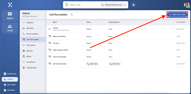 Once you're in the call flow builder, click on + new call flow at the top right corner to start creating your call flow.