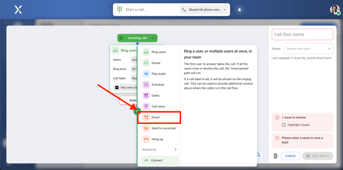 To divert the call when it’s unanswered, click on the plus icon under the ring users action. Then, select divert from the options.