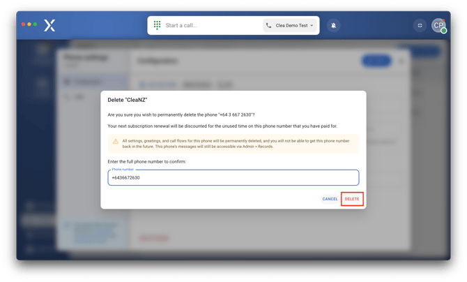 - Read the confirmation dialog carefully, and confirm the deletion by typing in the phone number.