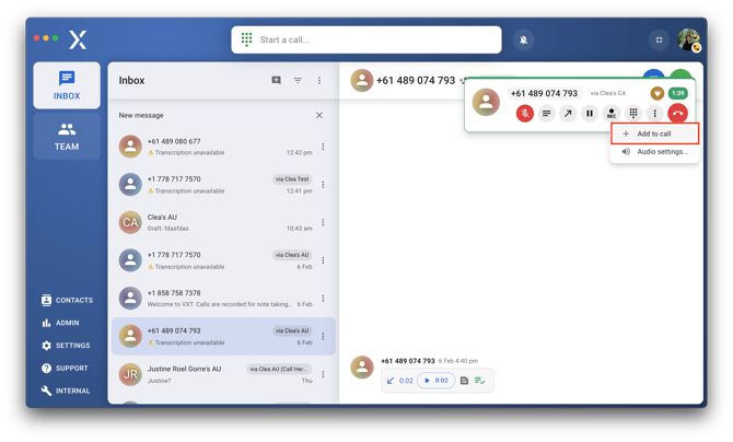 - Add to call - also known as call conference, which allows you to add other teammates to an ongoing call.