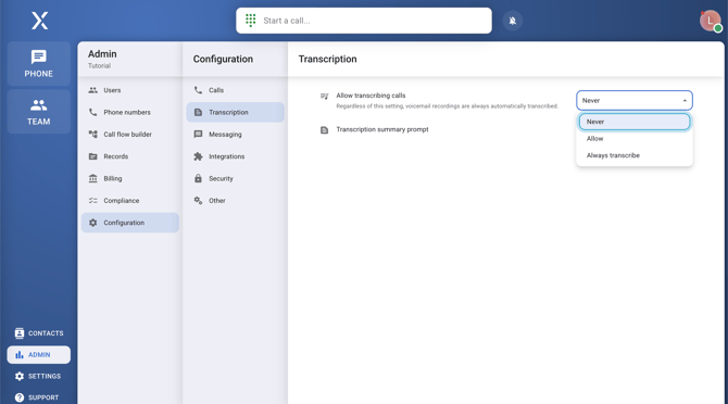 - Click on the allow transcribing calls menu and select allow, or never.