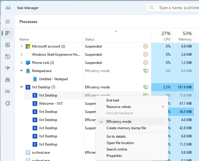 If so, this means that VXT is running in Efficiency mode which will limit CPU allocation to the app and can potentially cause issues. - To turn this off, expand VXT desktop, right click on the thread which has the Leaf icon and uncheck Efficiency mode: