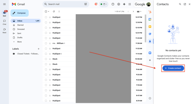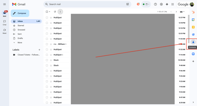 To begin, open your inbox. Find and select the Contacts section on the right-hand side of the screen.