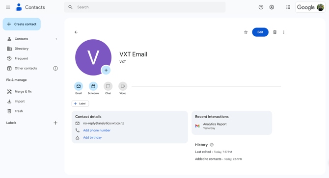Similar to Gmail, from there all you need to do is enter the address of the email you are trying to add to your contacts (no-reply@mg.vxt.co.nz) and then select 'Create'.