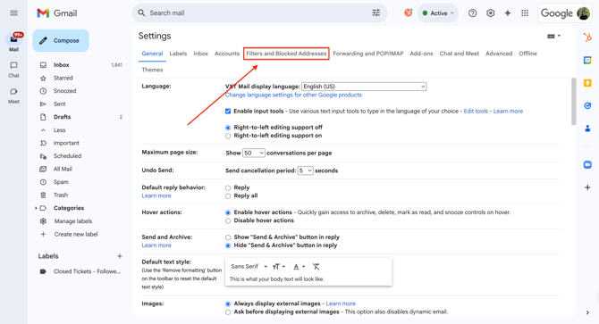From the Settings menu, select ‘Filters and Blocked Addresses’.
