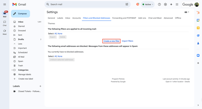 Once in the 'Filters and Blocked Addresses' section of the Settings, select the 'Create a new filter' option.