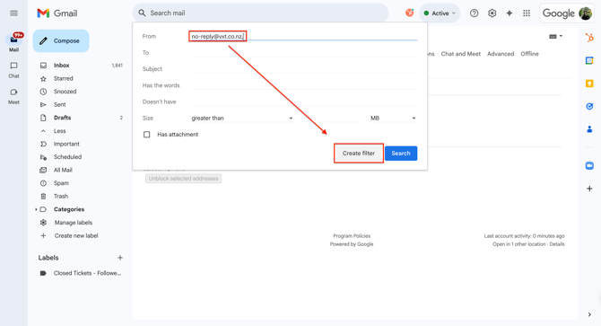 Enter the address of the email you want to whitelist in the ‘From’ field; in this case no-reply@mg.vxt.co.nz. Then select ‘Create filter'.