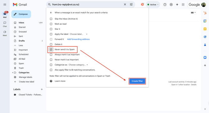 In the box titled ‘When a message is an exact match for your search criteria', tick the box that states 'Never sent it to Spam' and then hit the 'Create filter' button. This will confirm the rule and ensure all emails from this address arrive in your inbox.