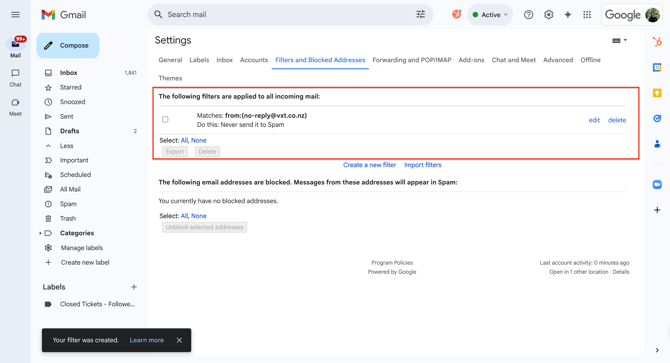 Once the rule for the filter has been successfully created, your filter settings should look like the image below.